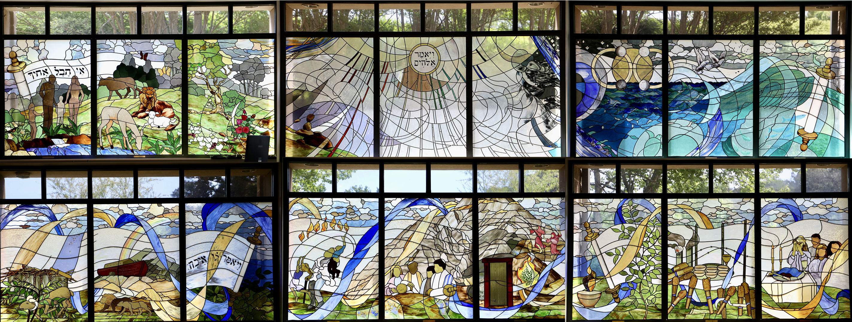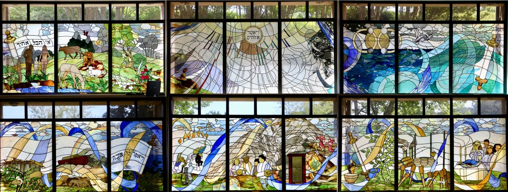 Temple Kol Emeth, sanctuary stained glass depiction of the Story of the Jewish People